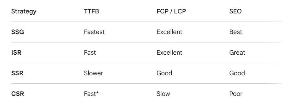 There is no single best strategy. Use SSG/ISR for speed and SEO, and reserve SSR/CSR for highly dynamic or private data. Choose wisely to keep your Web Vitals in the green.
